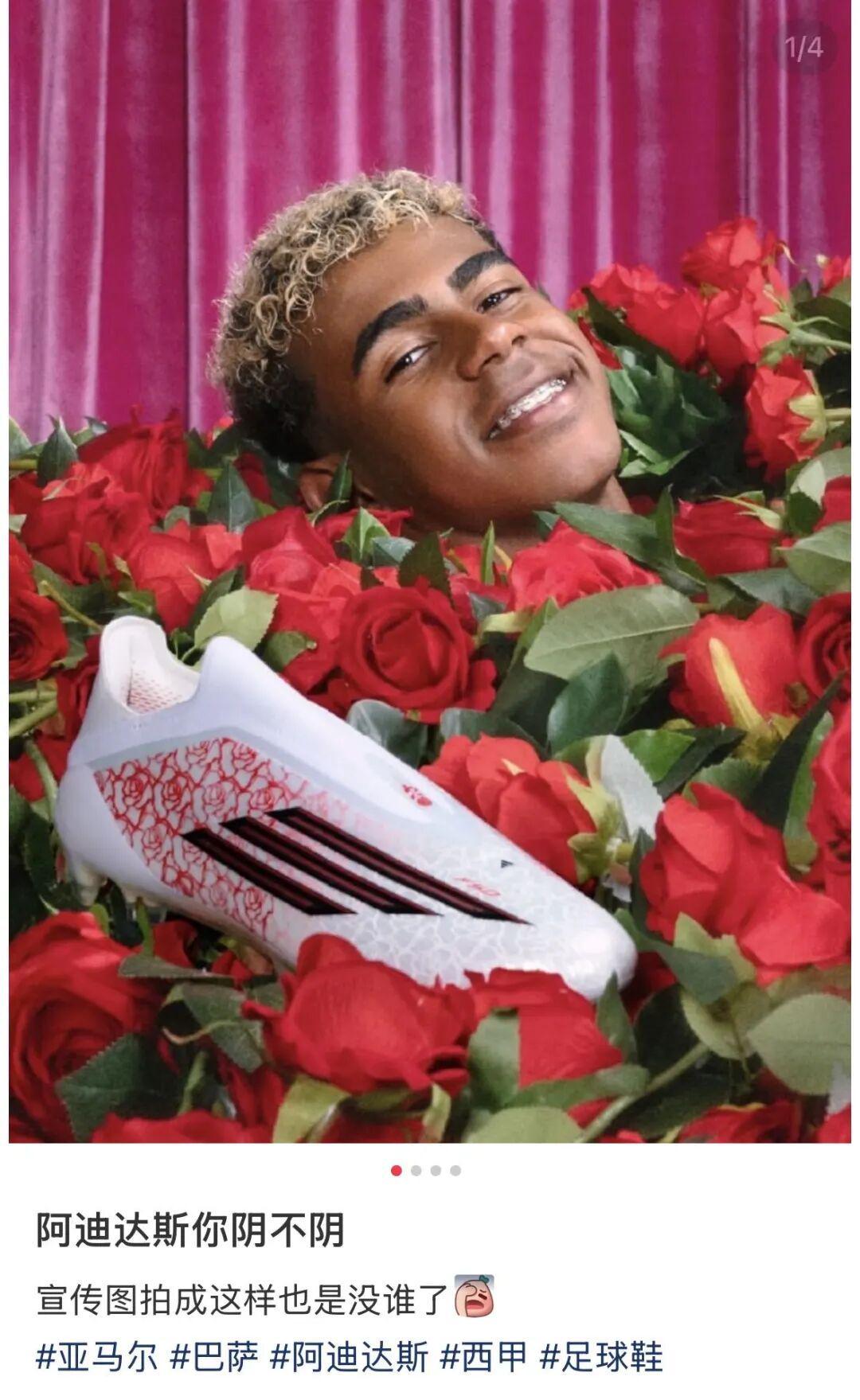 画面背景是粉红色的幕布,亚马尔整个人被一堆红色玫瑰花淹没,就剩一颗脑袋和两只穿着新球鞋的脚倔强地露在外面。